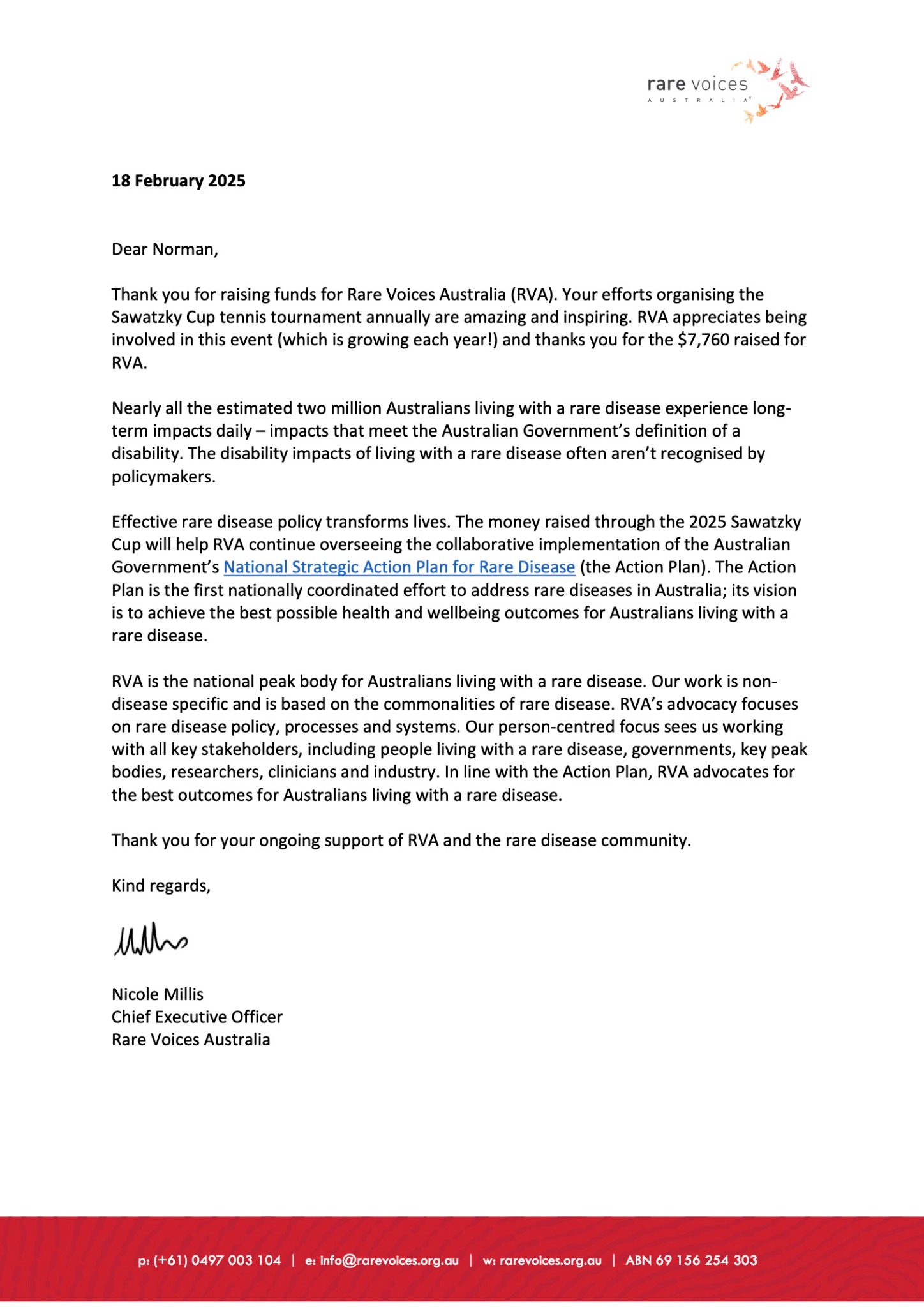 We'll again be raising funds and awareness for rare illnesses and disease, in memory of our tennis mate Ross Sawatzky, and on behalf of Rare Voices Australia.