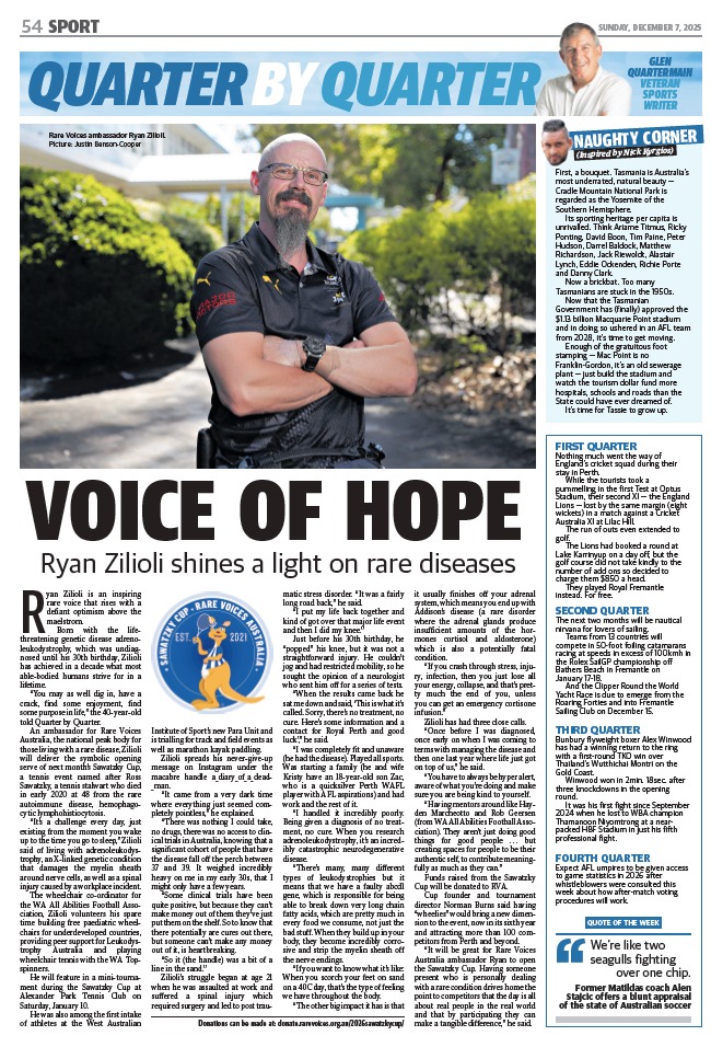 MANY THANKS to one of WA's top sports journalists, Glen Quartermain, for the great profile of Rare Voices Australia ambassador Ryan Zilioli -- and his role at the 2026 Sawatzky Cup -- in the Sunday Times.